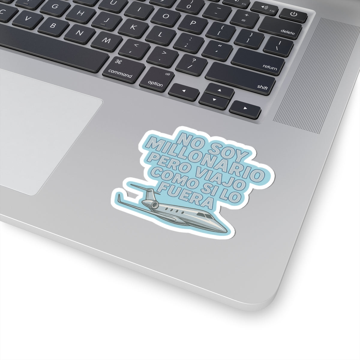 Una pegatina divertida y viajera con personalidad. Las letras en azul suave dicen "NO SOY MILLONARIO PERO VIAJO COMO SI LO FUERA" sobre la elegante ilustración de un jet privado: un guiño atrevido a la pasión por los viajes y al estilo aspiracional. El vinilo brillante semi-cortado resalta los colores brillantes de la impresión eco-solvente y un sutil contorno blanco para una colocación impecable en portátiles, diarios, botellas de agua o etiquetas de equipaje. Se aplica con suavidad y se mantiene en superficies planas de interior, aportando un toque viajero y desenfadado a tus artículos de diario.